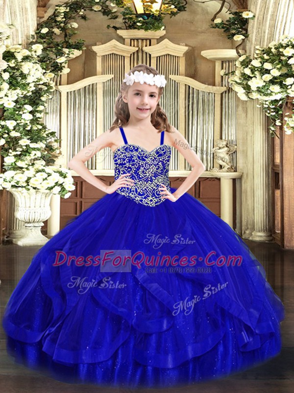 Royal Blue Ball Gowns Beading and Ruffles Pageant Gowns For Girls Lace Up Tulle Sleeveless Floor Length