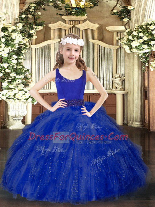 Royal Blue Tulle Zipper Little Girl Pageant Dress Sleeveless Floor Length Beading and Ruffles