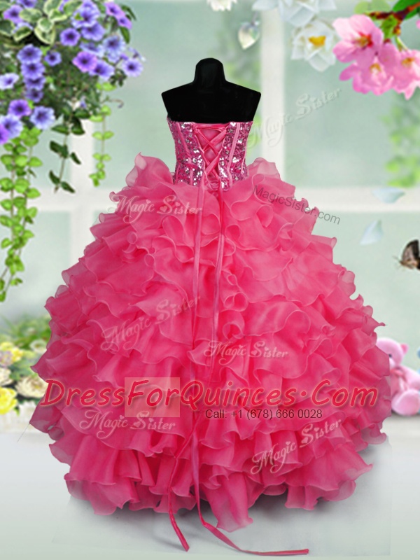 Ruffled Layers and Sequins Pageant Gowns For Girls Hot Pink Lace Up Sleeveless Floor Length