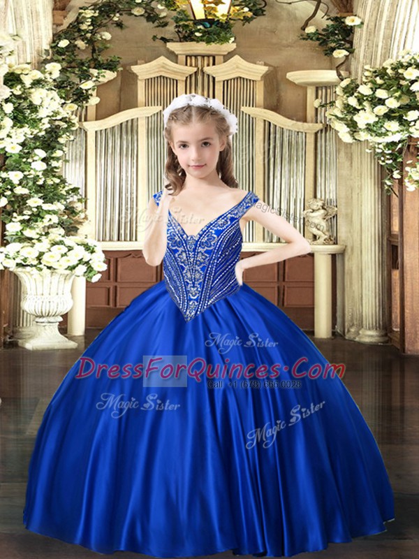 Simple Floor Length Royal Blue Child Pageant Dress Satin Sleeveless Beading