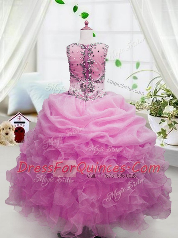 Sleeveless Floor Length Beading and Ruffles and Pick Ups Zipper Little Girl Pageant Dress with Pink