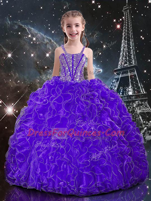 Straps Sleeveless Little Girls Pageant Dress Floor Length Beading and Ruffles Eggplant Purple Organza