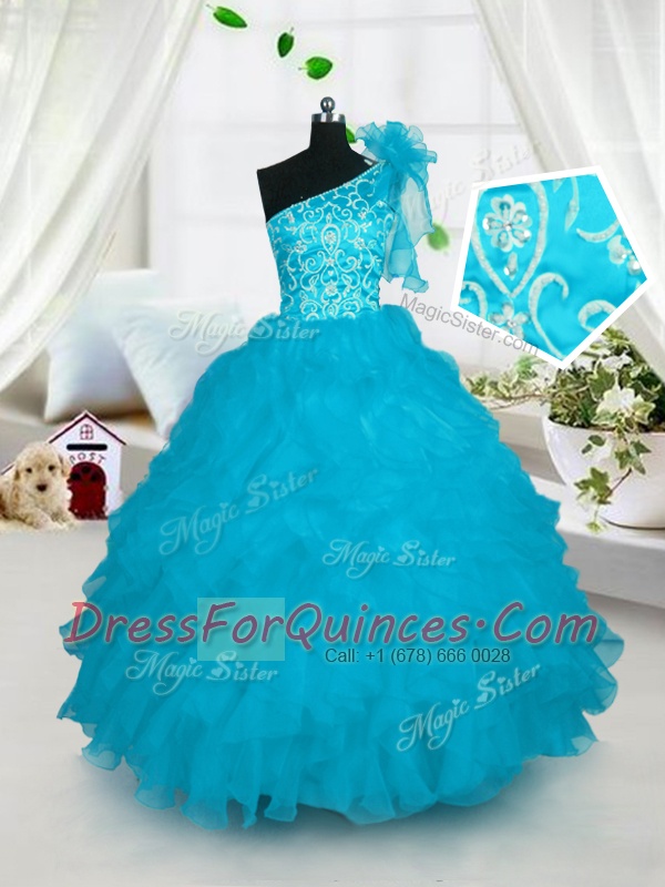 Sweet Turquoise Ball Gowns Organza One Shoulder Sleeveless Embroidery and Ruffles Floor Length Lace Up Kids Formal Wear
