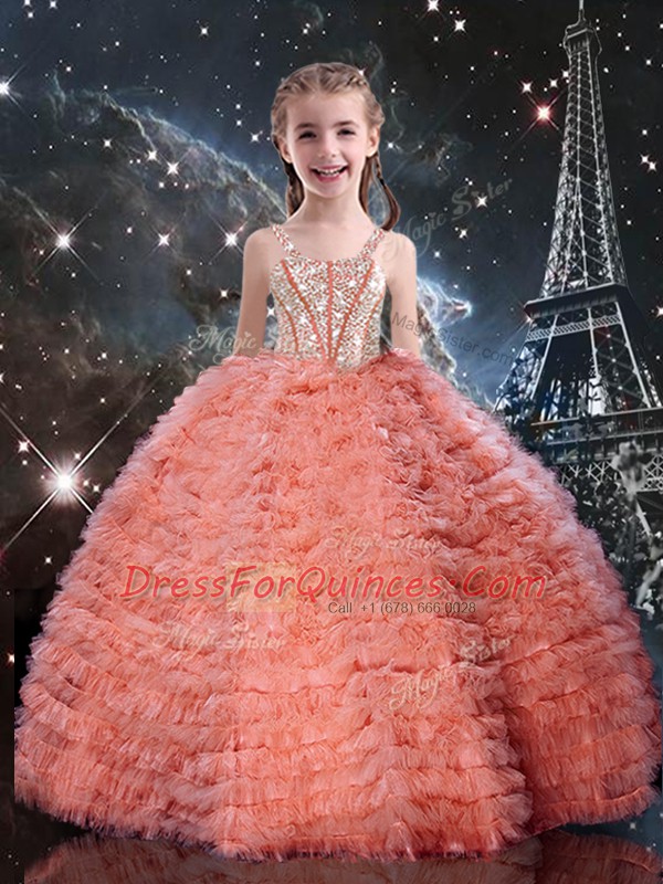 Watermelon Red Tulle Lace Up Straps Sleeveless Floor Length Little Girls Pageant Gowns Beading and Ruffled Layers
