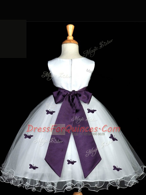 White Sleeveless Knee Length Appliques and Bowknot and Hand Made Flower Zipper Little Girls Pageant Gowns