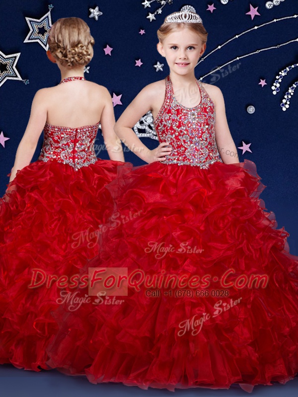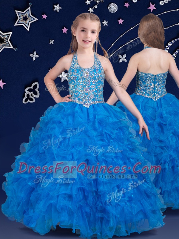 Wine Red and Baby Blue and Turquoise Little Girls Pageant Gowns Quinceanera and Wedding Party and For with Beading and Ruffles Halter Top Sleeveless Zipper