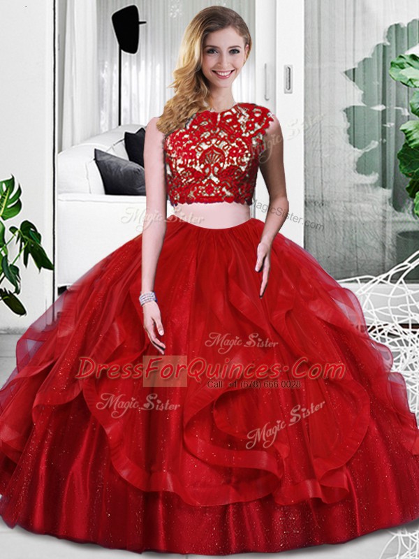 Admirable Wine Red Tulle Zipper 15th Birthday Dress Sleeveless Floor Length Lace and Ruffles