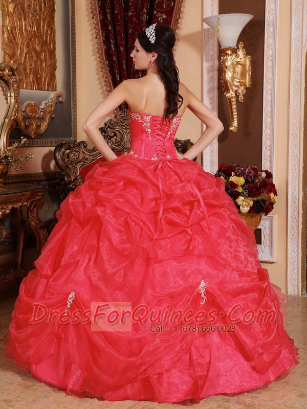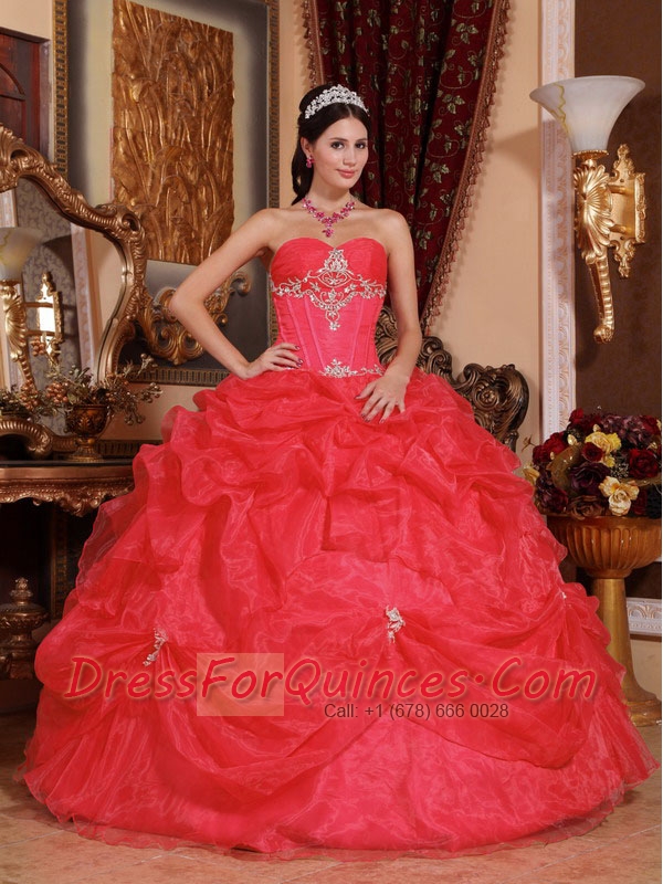 Coral Red Appliques Organza Sweetheart with Beading and Pick Ups Ball Gown Dress