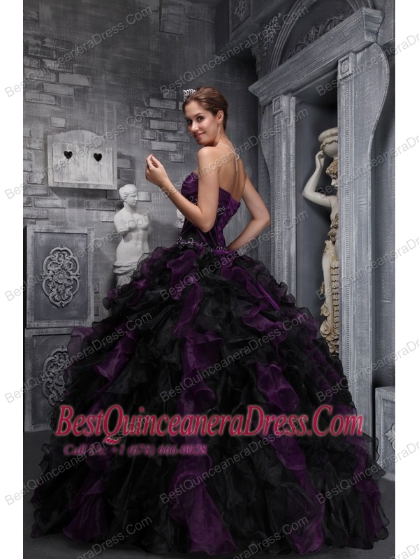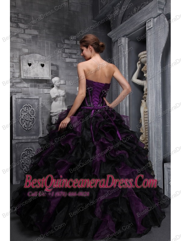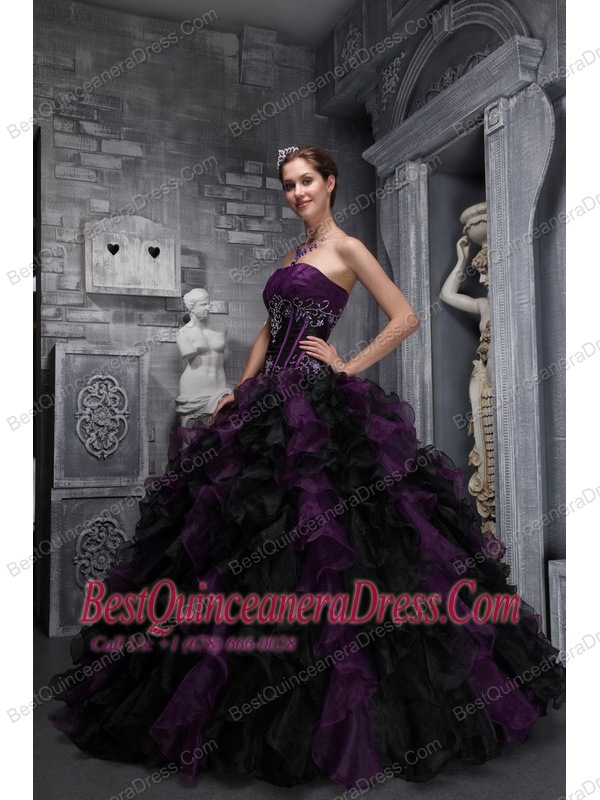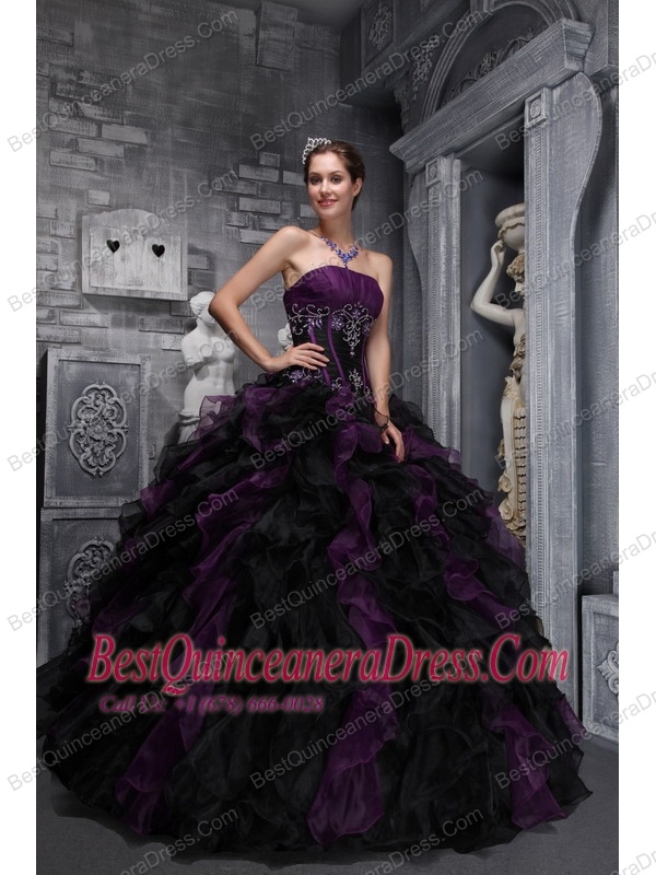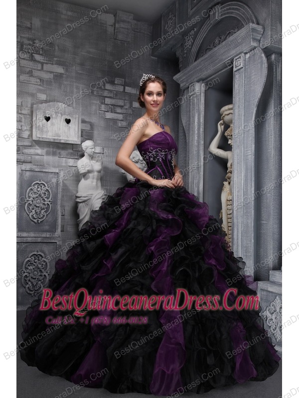 Drak Purple and Black Ball Gown Strapless Floor-length Taffeta and Organza Appliques and Ruffles Quinceanera Dress