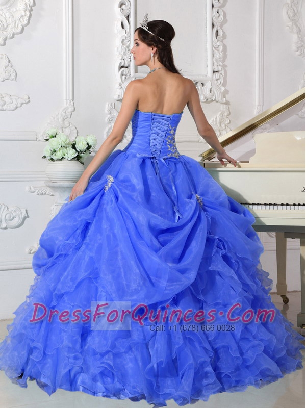 Fashinable Strapless Organza Beading Ball Gown Dress with Appliques and Ruffles in Blue