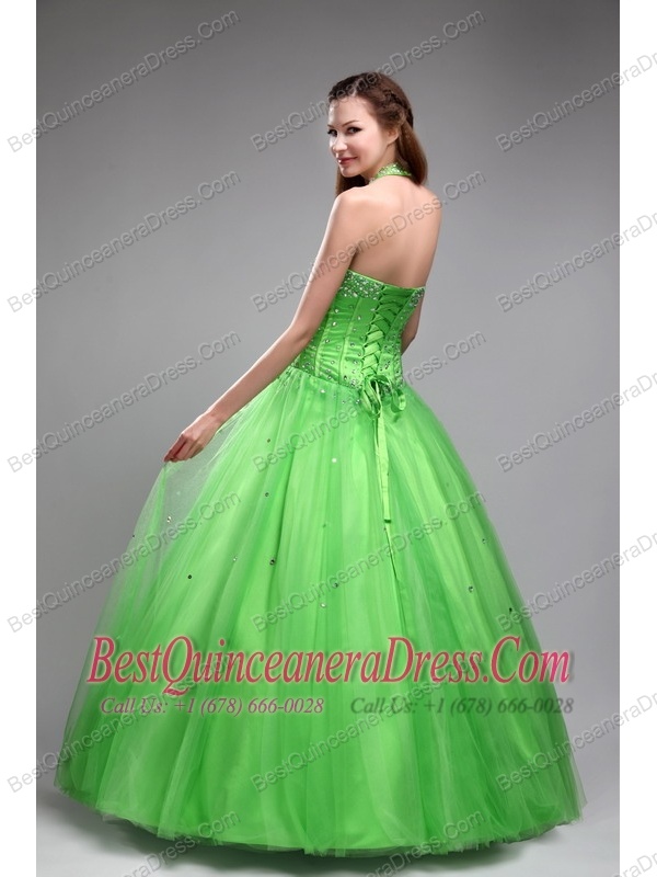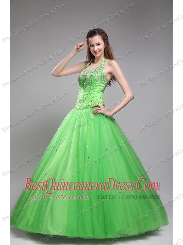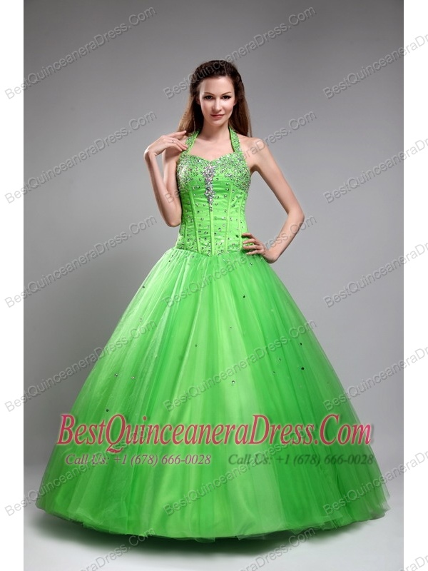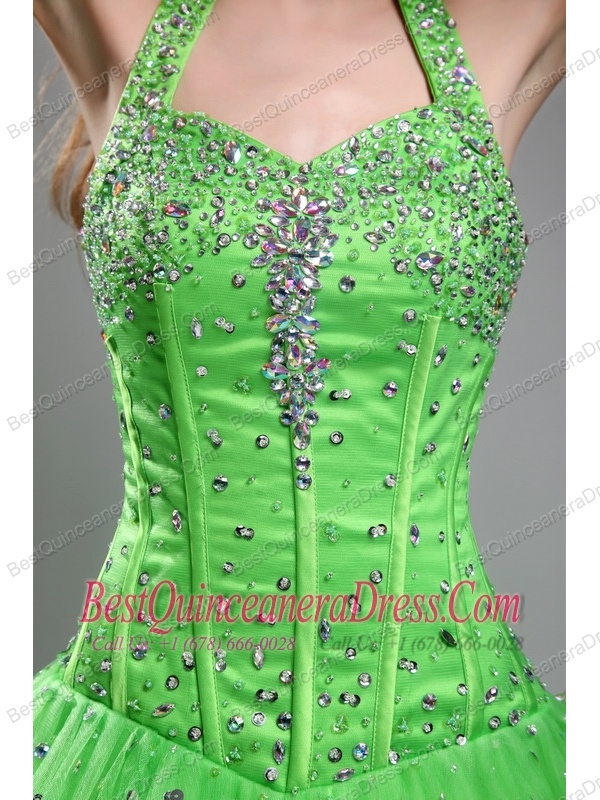 Green Ball Gown Halter Floor-length Tulle Beading Quinceanera Dress