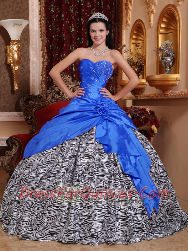 Taffeta and Zebra Blue Sweetheart Beading Ball Gown Dress with Hand Made Flower and Ruching