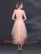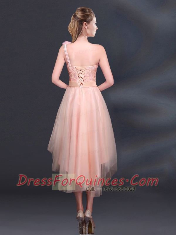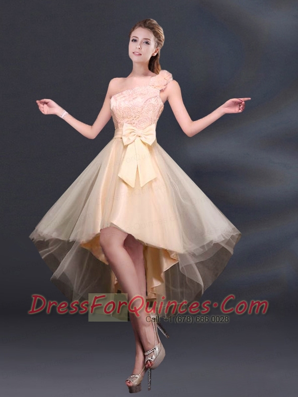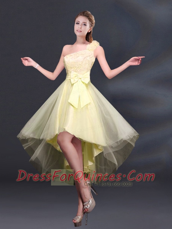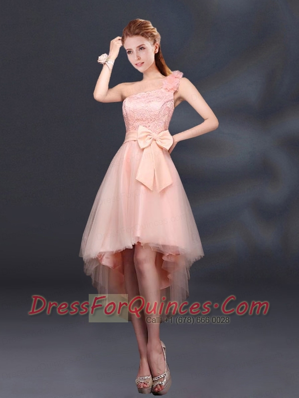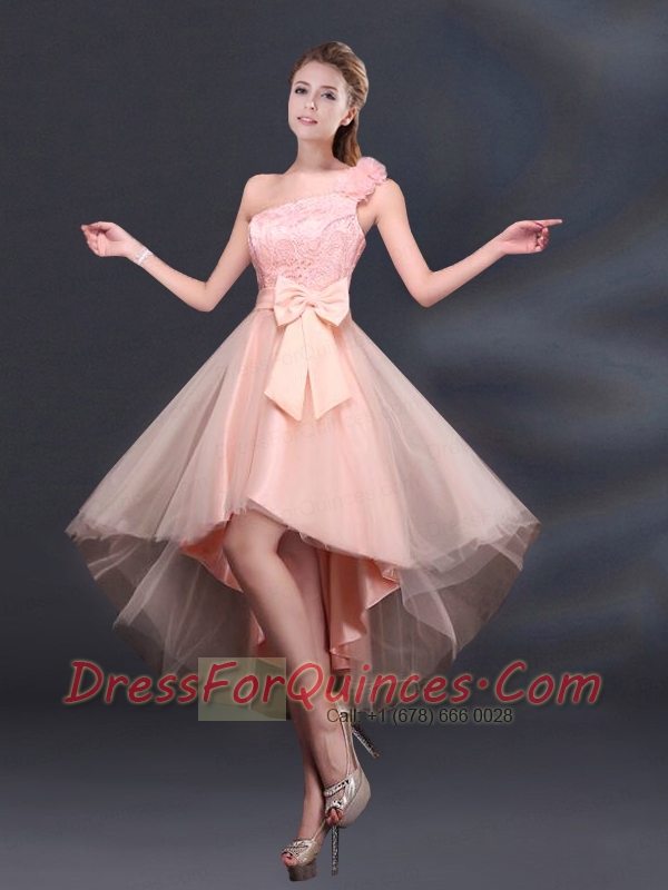 2015 Bowknot High Low Lace Up Dama Dress with One Shoulder