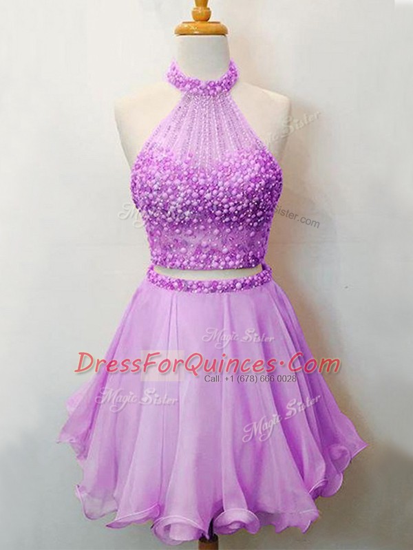 Best Lilac Organza Lace Up Halter Top Sleeveless Knee Length Quinceanera Court of Honor Dress Beading