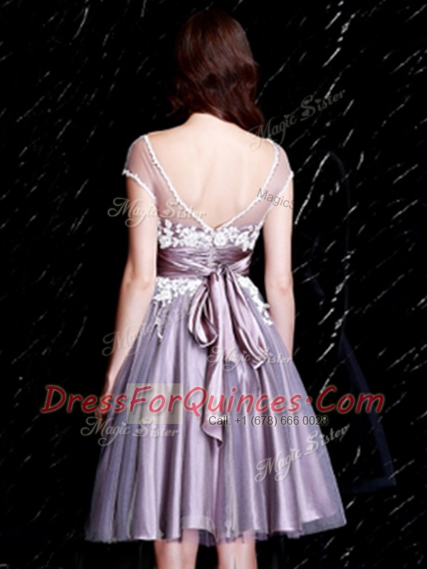 Charming Tulle Short Sleeves Knee Length Quinceanera Dama Dress and Appliques and Belt