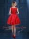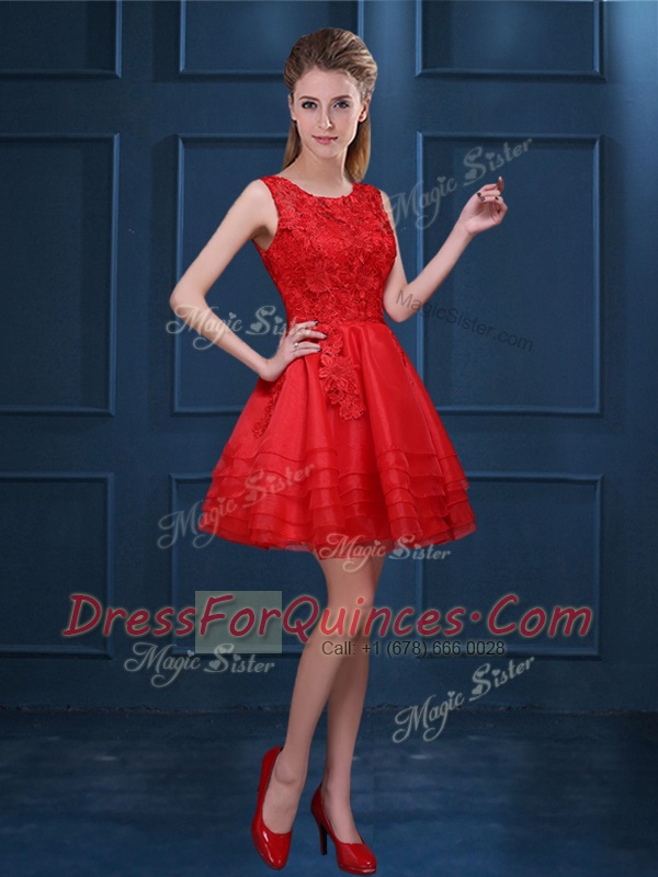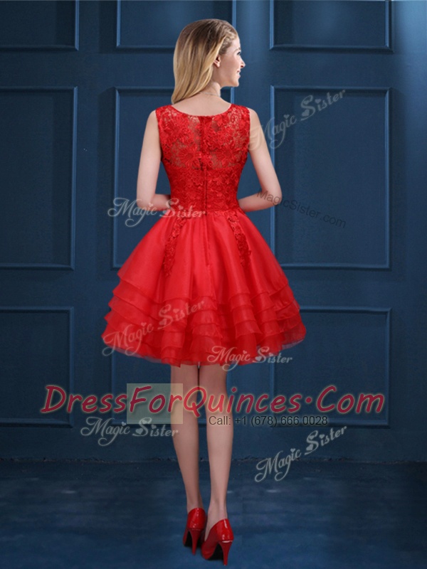Custom Design Scoop Sleeveless Organza Mini Length Zipper Quinceanera Court Dresses in Red with Lace and Ruffled Layers