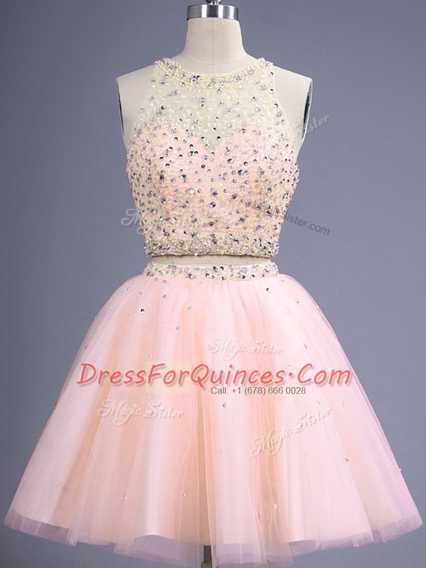 Dazzling Beading Dama Dress Peach Lace Up Sleeveless Knee Length