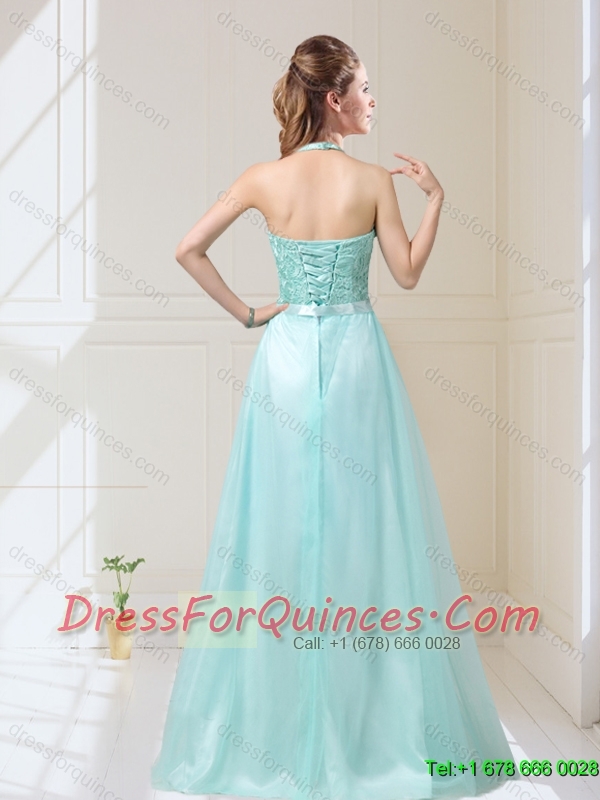 Elegant Empire Halter Top Laced Mint Dama Dresses with Sash