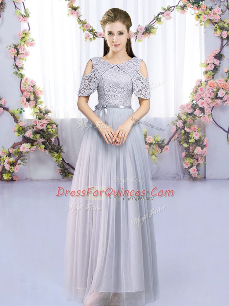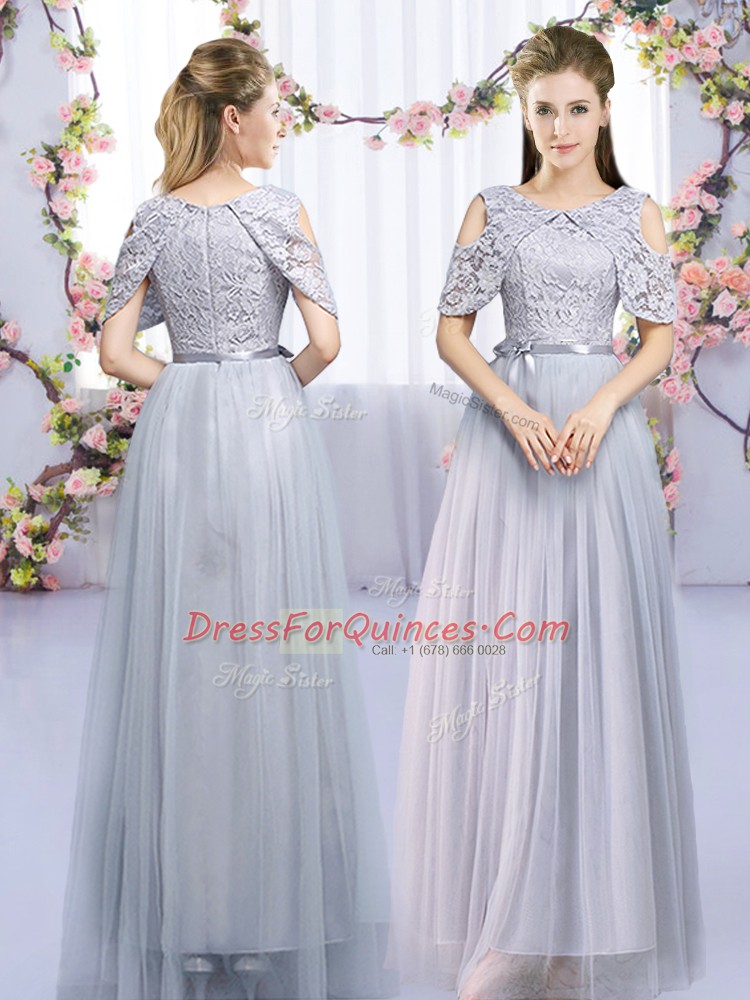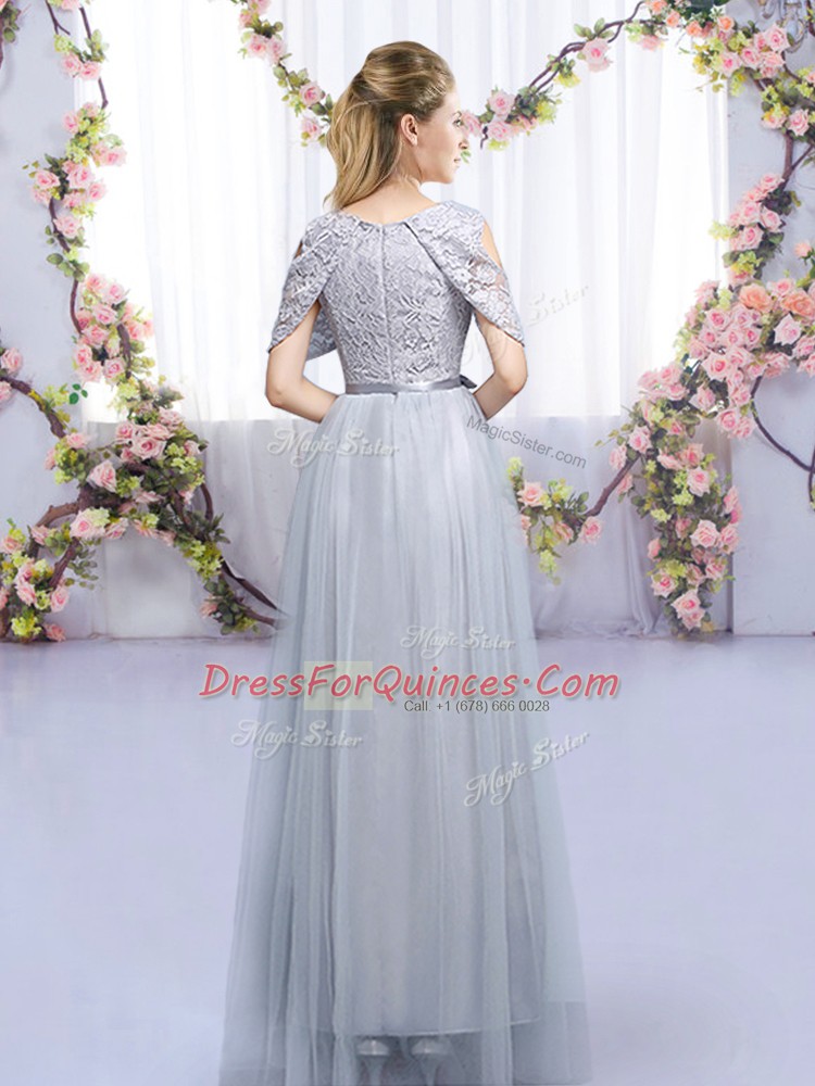 Grey Tulle Zipper Scoop Sleeveless Floor Length Quinceanera Court Dresses Lace and Belt