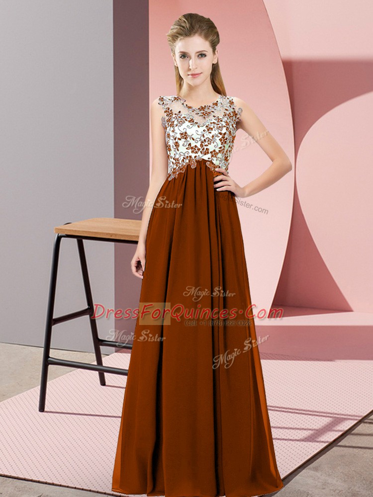High Class Scoop Sleeveless Dama Dress for Quinceanera Floor Length Beading and Appliques Brown Chiffon