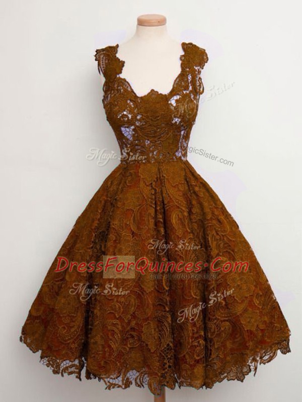 Knee Length Brown Quinceanera Dama Dress Lace Sleeveless Lace