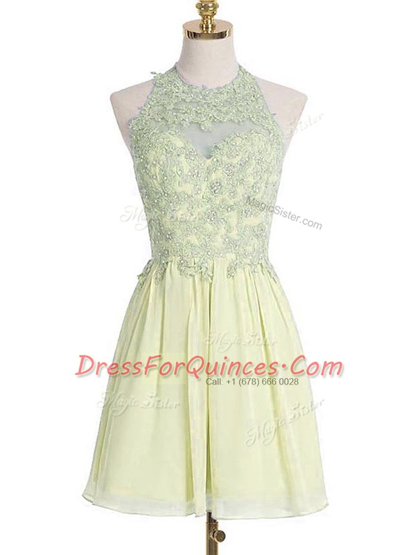 Light Yellow Chiffon Lace Up Halter Top Sleeveless Knee Length Dama Dress for Quinceanera Appliques