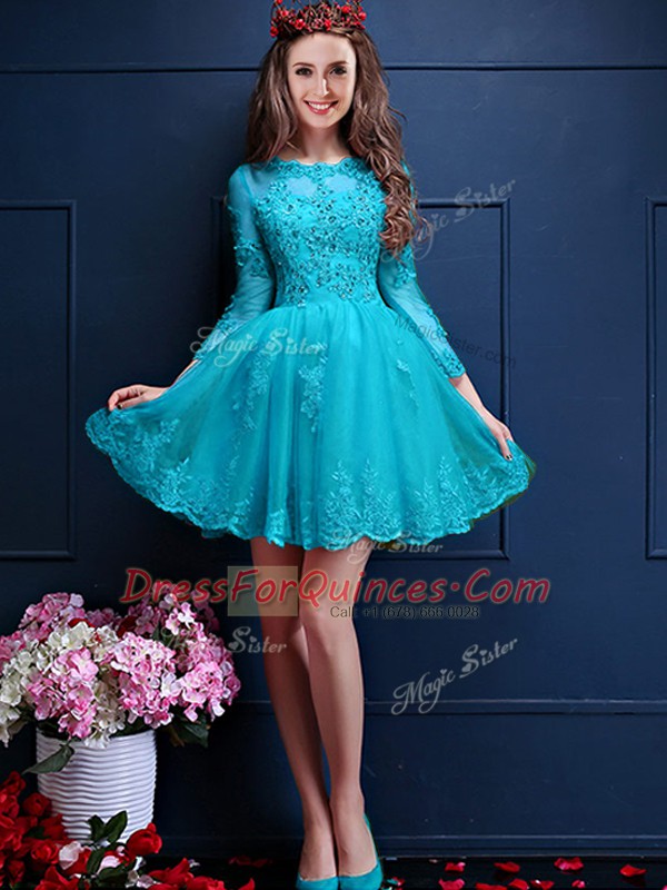 Mini Length Lace Up Quinceanera Dama Dress Aqua Blue for Prom and Party with Beading and Lace and Appliques