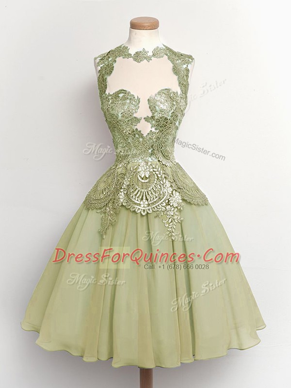 Modern Olive Green Chiffon Lace Up Damas Dress Sleeveless Knee Length Lace