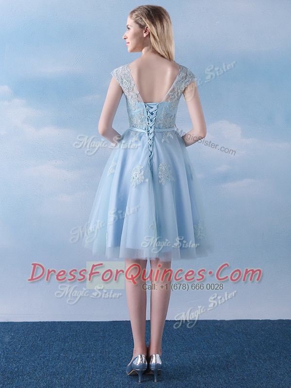 Nice Scoop Cap Sleeves Appliques and Belt Lace Up Dama Dress
