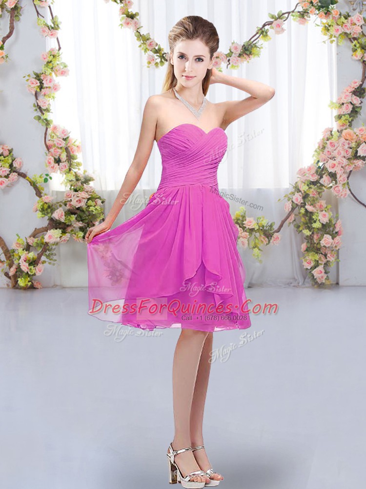Nice Sleeveless Chiffon Knee Length Lace Up Damas Dress in Fuchsia with Ruffles and Ruching