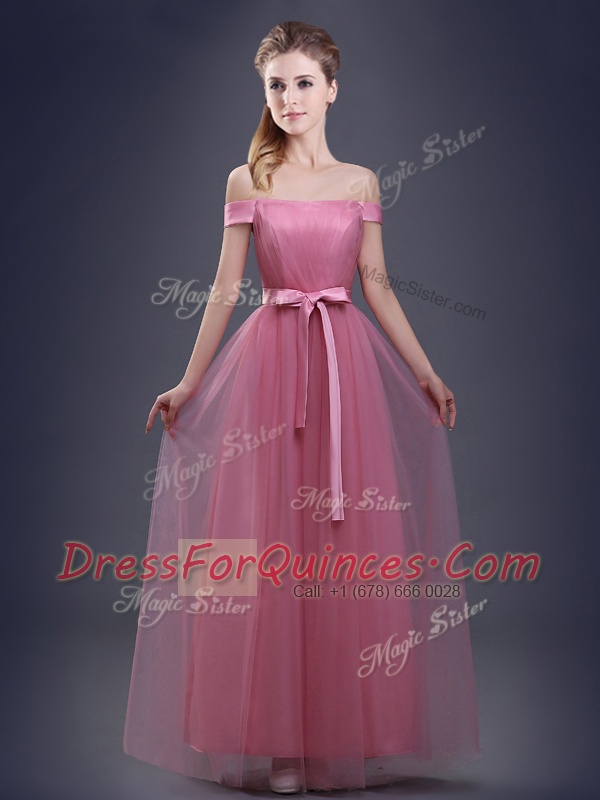 Off the Shoulder Pink Sleeveless Floor Length Ruching and Bowknot Lace Up Damas Dress