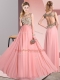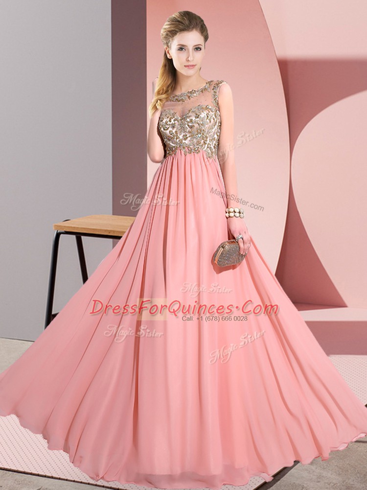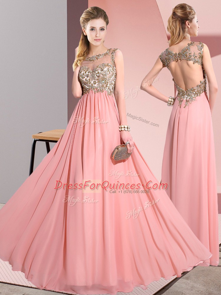 Pink Chiffon Backless Quinceanera Court Dresses Sleeveless Floor Length Beading and Appliques