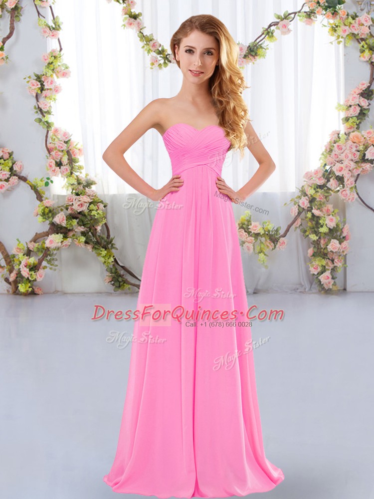 Ruching Quinceanera Court of Honor Dress Rose Pink Lace Up Sleeveless Floor Length