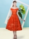 Rust Red Quinceanera Dama Dress Prom and Party and Wedding Party with Bowknot Off The Shoulder Cap Sleeves Lace Up