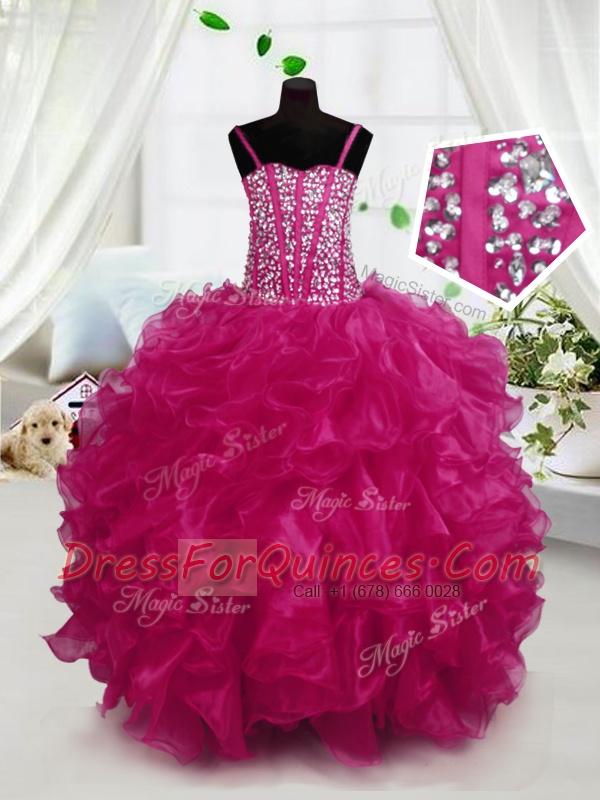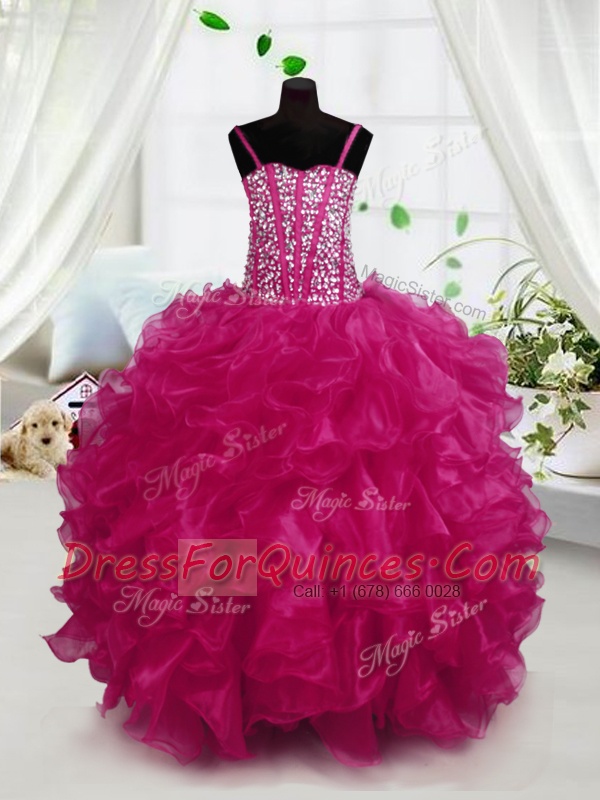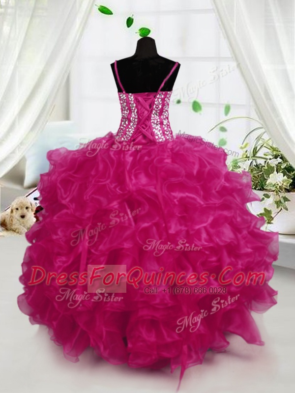 Hot Pink Ball Gowns Beading and Ruffles Kids Pageant Dress Lace Up Organza Sleeveless Floor Length