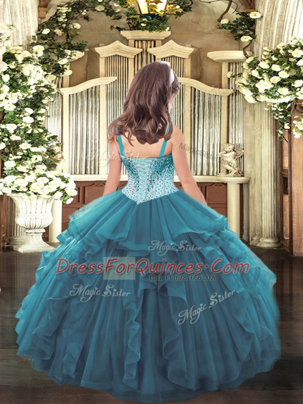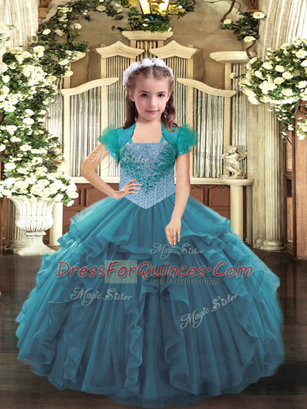 Teal Ball Gowns Organza Straps Sleeveless Beading and Ruffles Floor Length Lace Up Kids Formal Wear