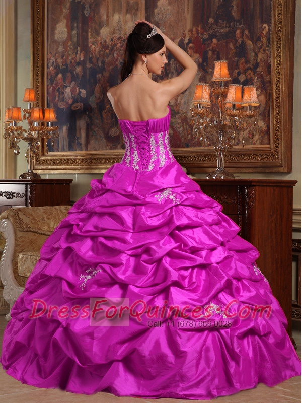 2014 Impressive Strapless Fuchsia Ball Gown Floor-length Appliques Taffeta Beautiful Quinceanera Dress