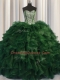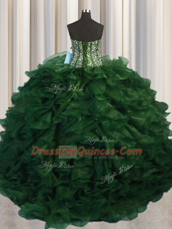 Adorable Visible Boning Bling-bling Green Organza Lace Up Sweetheart Sleeveless With Train Quince Ball Gowns Brush Train Beading