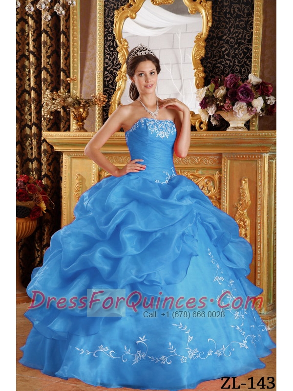 Aqua Blue Ball Gown Strapless Floor-length Embroidery Organza Beautiful Quinceanera Dress