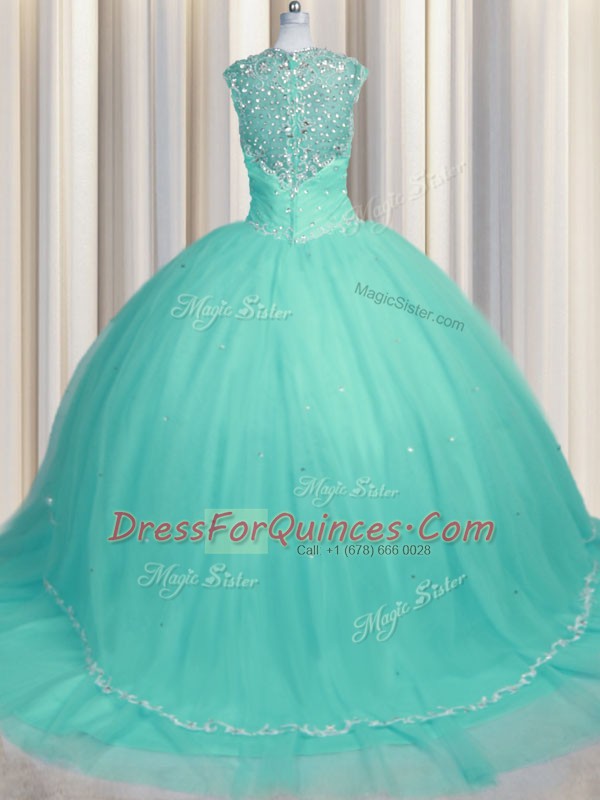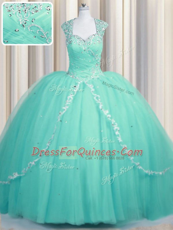 Aqua Blue Zipper Vestidos de Quinceanera Beading and Appliques Cap Sleeves Brush Train
