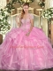 Beauteous Rose Pink Sleeveless Appliques and Ruffles Floor Length Sweet 16 Dress