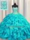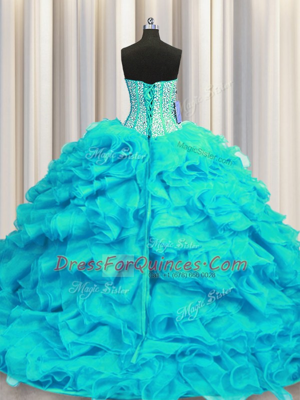 Beautiful Visible Boning Aqua Blue Lace Up Quinceanera Dress Beading and Ruffles Sleeveless Brush Train