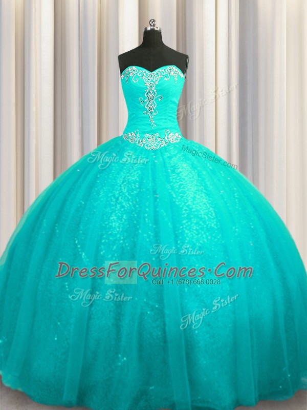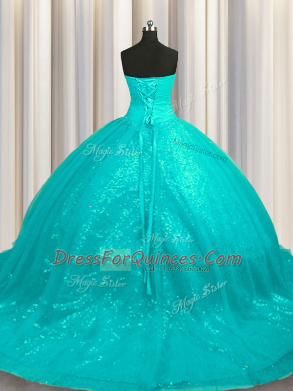 Best Selling Sleeveless Organza and Sequined Court Train Lace Up 15 Quinceanera Dress in Aqua Blue with Beading and Appliques
