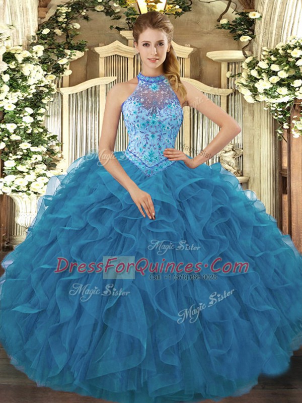 Best Teal Sleeveless Organza Lace Up Quinceanera Dress for Sweet 16 and Quinceanera