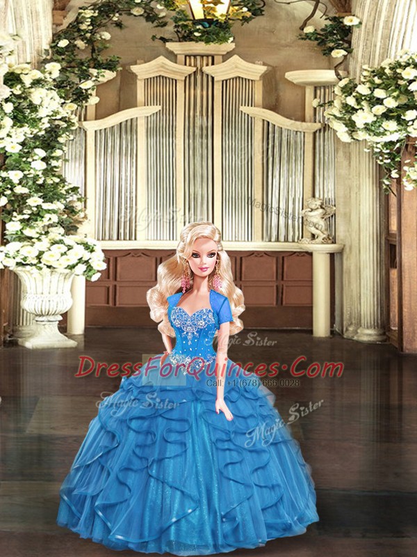 Blue Tulle Lace Up Sweet 16 Quinceanera Dress Sleeveless Floor Length Beading and Ruffles