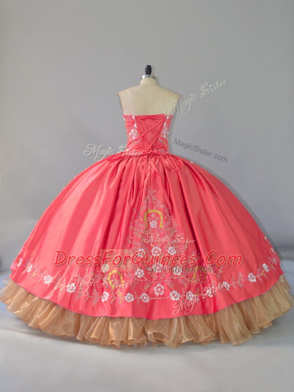 Clearance Watermelon Red Satin and Organza Lace Up Quinceanera Gowns Sleeveless Floor Length Embroidery