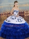 Custom Design Royal Blue Lace Up Sweetheart Embroidery and Ruffled Layers and Bowknot Ball Gown Prom Dress Organza Sleeveless