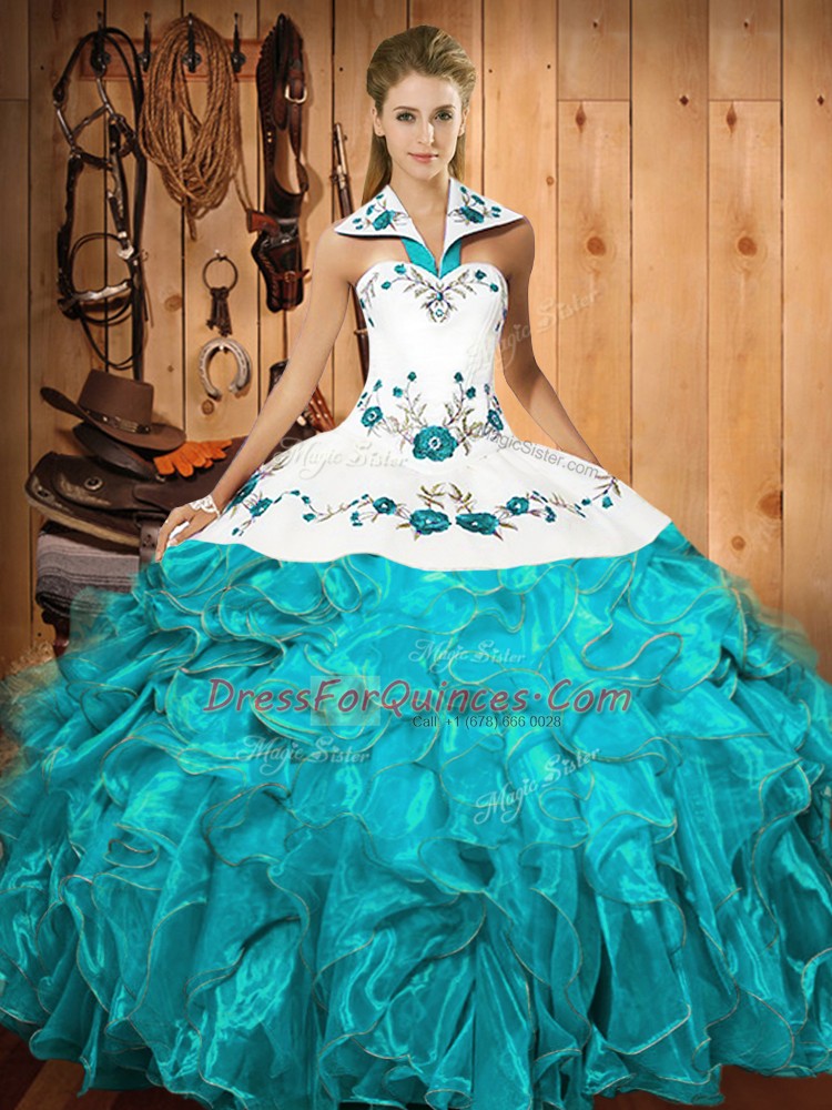 Cute Sleeveless Satin and Organza Floor Length Lace Up Ball Gown Prom Dress in Aqua Blue with Embroidery and Ruffles