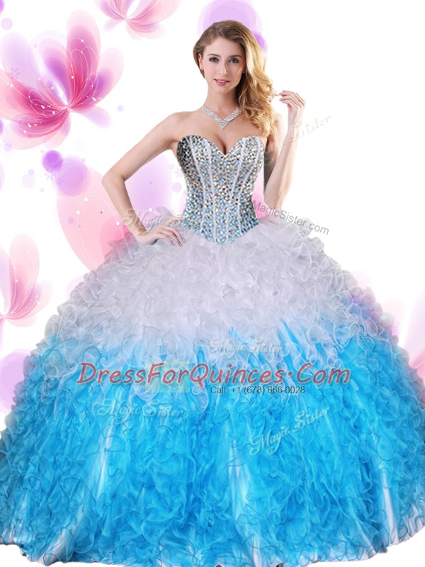Designer Sweetheart Sleeveless Lace Up Quinceanera Gowns Blue And White Organza