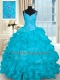 Exceptional Beading and Embroidery and Ruffles Quince Ball Gowns Aqua Blue Lace Up Sleeveless Brush Train